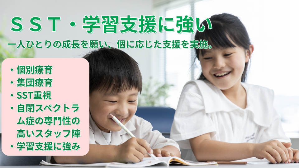 特に、SST(ソーシャルスキルトレーニング)に力を入れ、お子さまたちが他者と豊かに関わり合えるよう、丁寧にサポートしていきます。